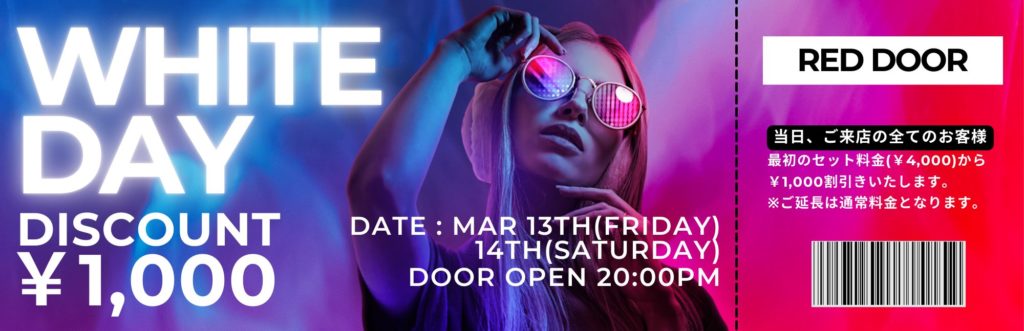 最初の一時間をとってもお得に楽しめるチャンスです! ホワイトデーの夜は、レッドドアの可愛い女の子たちと一緒に楽しく乾杯しませんか?